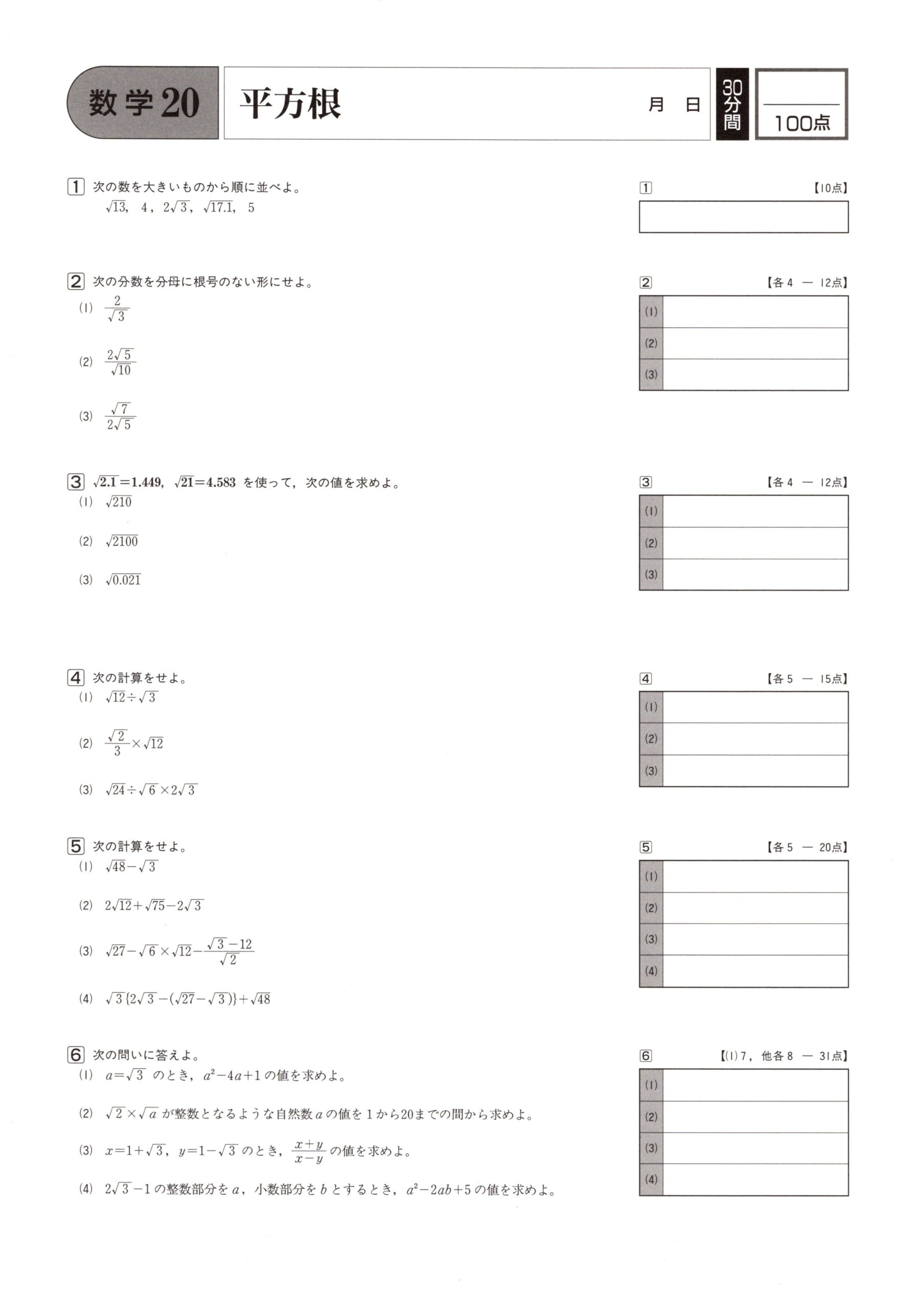 ⑳平方根 学力テスト対策 数学 2021.08.202021.08.26 スポンサーリンク スポンサーリンク ⑳平方根の問題はこちら 小さくて見にくいときはこちら ⑳ 平方根 解答はこちら 学力テスト対策 数学 解答ページ 大問ごとの解説動画1⃣ 大問ごとの解説動画2⃣ 大問ごとの解説動画3⃣ 大問ごとの解説動画4⃣ 大問ごとの解説動画5⃣ 大問ごとの解説動画6⃣