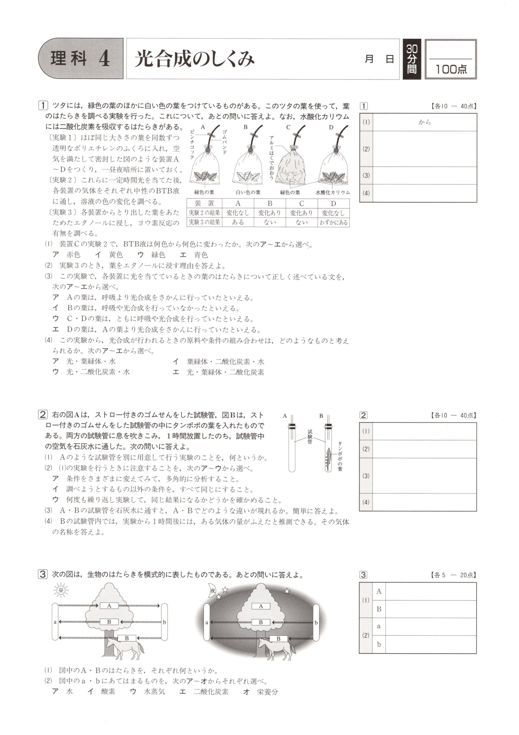 ④光合成のしくみ 学力テスト対策 理科 2021.08.212021.08.27 スポンサーリンク スポンサーリンク ④光合成のしくみの問題はこちら 小さくて見にくいときはこちら 4 光合成のしくみ 解答はこちら 学力テスト対策 理科 解答ページ