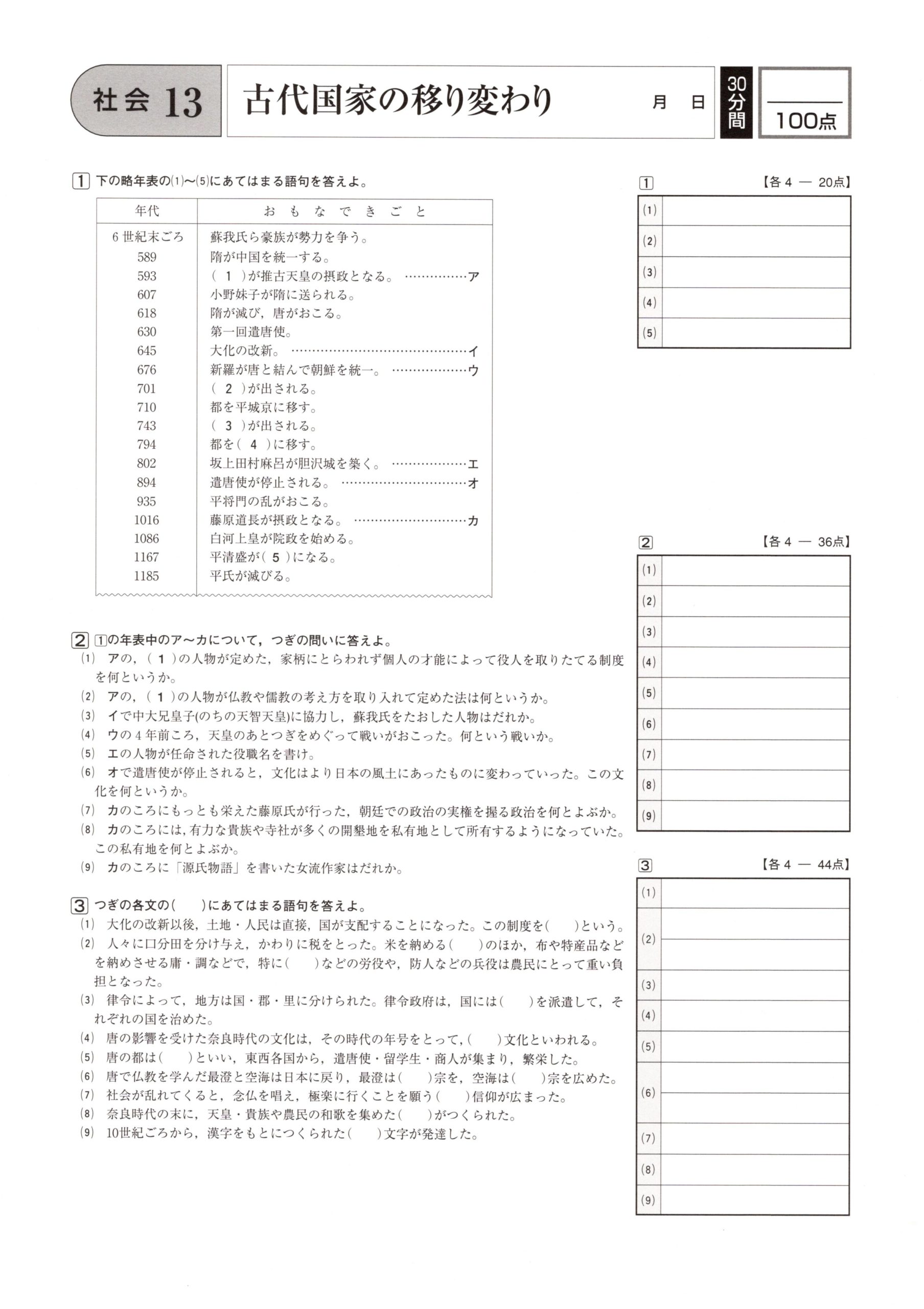 ⑬古代国家の移り変わり 学力テスト対策 社会 2021.08.212021.08.27 スポンサーリンク スポンサーリンク ⑬古代国家の移り変わりの問題はこちら 小さくて見にくいときはこちら 13 古代国家の移り変わり 解答はこちら 学力テスト対策 社会 解答ページ