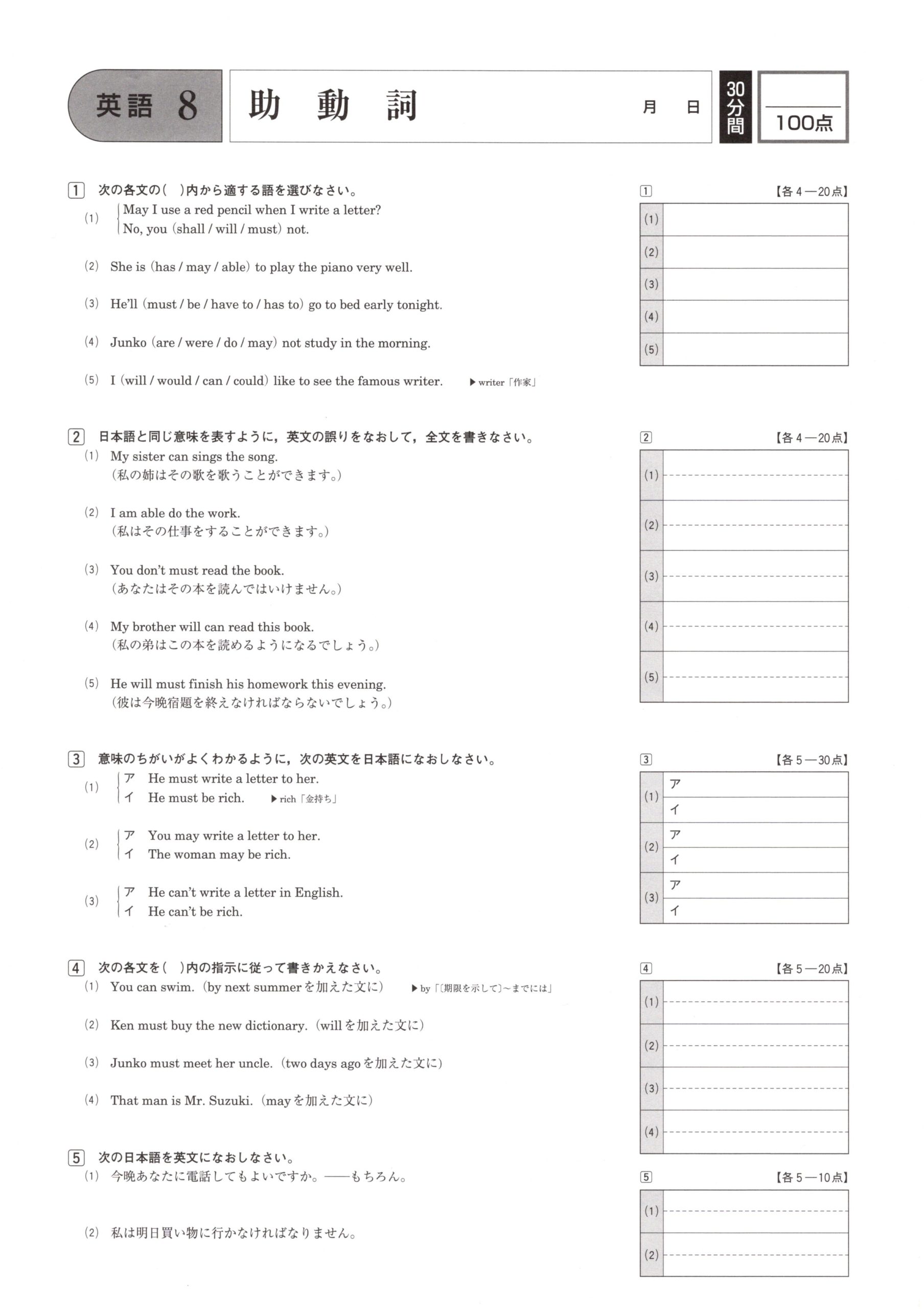⑧助動詞 学力テスト対策 英語 2021.08.262021.08.27 スポンサーリンク スポンサーリンク ⑧助動詞の問題はこちら 小さくて見にくいときはこちら 8 助動詞 解答はこちら 学力テスト対策 英語 解答ページ 解説は下の動画を見てみよう。 大問ごとの解説動画1⃣ 大問ごとの解説動画2⃣ 大問ごとの解説動画3⃣ 大問ごとの解説動画4⃣ 大問ごとの解説動画5⃣ 大問ごとの解説動画6⃣