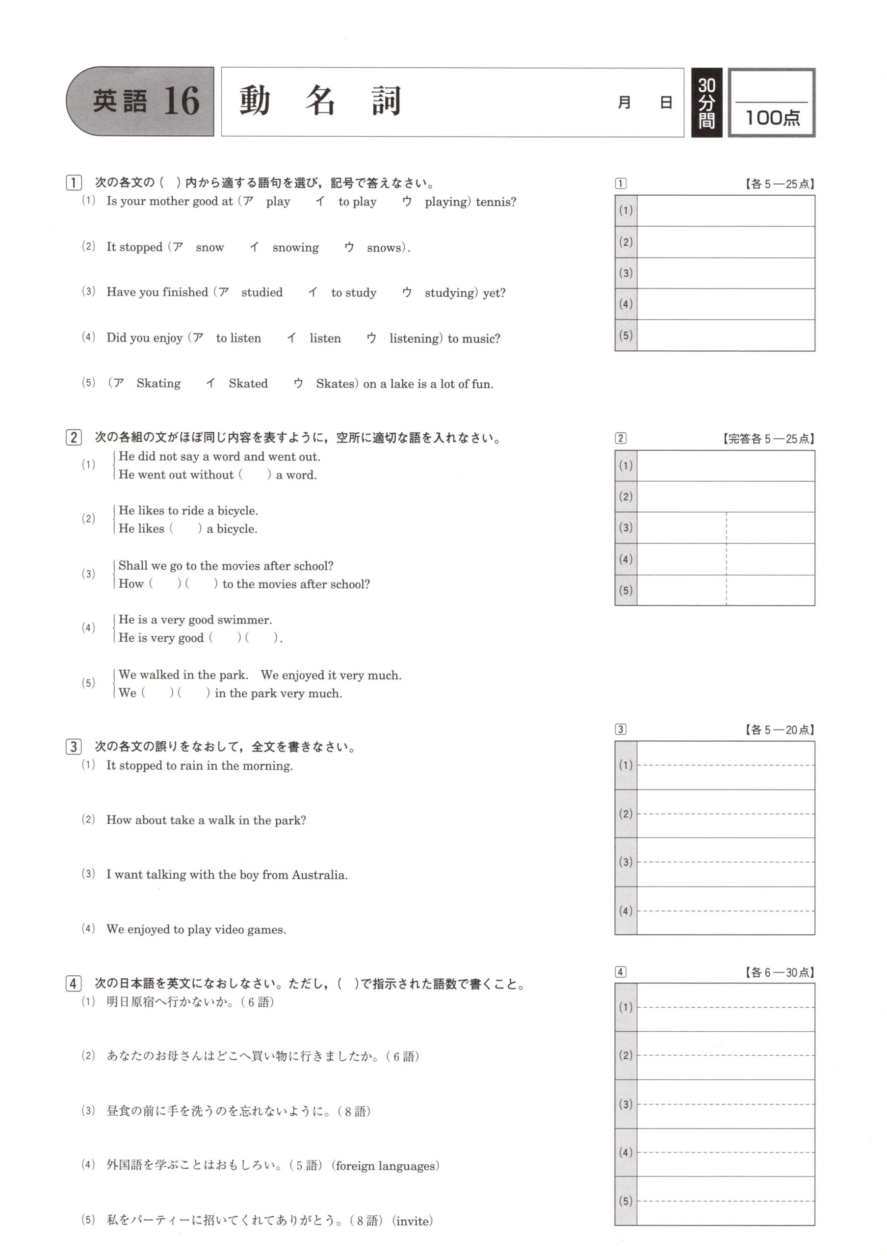 ⑯動名詞 学力テスト対策 英語 2021.08.262021.08.27 スポンサーリンク スポンサーリンク ⑯動名詞の問題はこちら 小さくて見にくいときはこちら 16 動名詞 解答はこちら 学力テスト対策 英語 解答ページ 解説は下の動画を見てみよう。 大問ごとの解説動画1⃣ 大問ごとの解説動画2⃣ 大問ごとの解説動画3⃣ 大問ごとの解説動画4⃣ 大問ごとの解説動画5⃣ 大問ごとの解説動画6⃣
