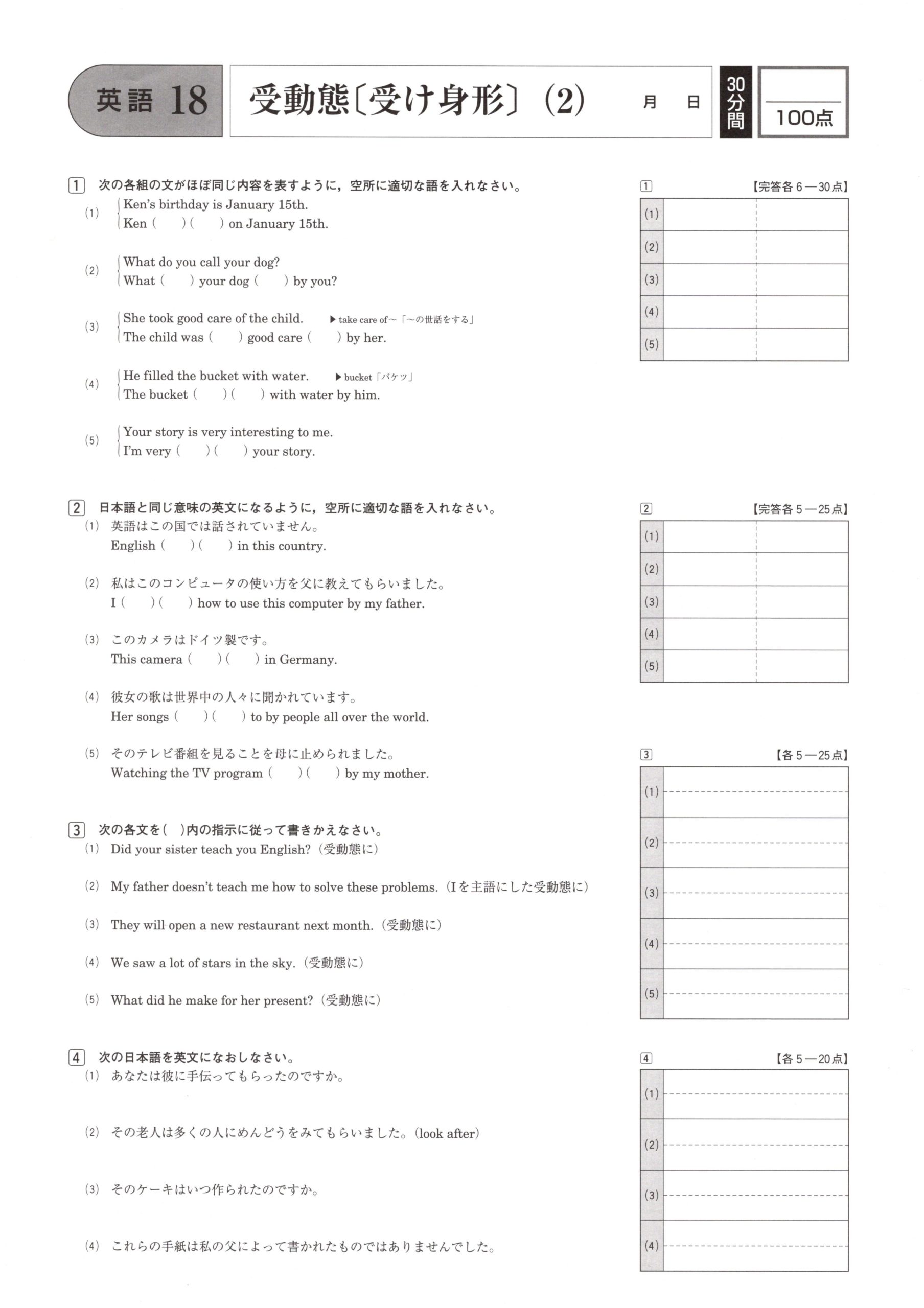 ⑱受動態〔受け身形〕(2) 学力テスト対策 英語 2021.08.262021.08.27 スポンサーリンク スポンサーリンク ⑱受動態〔受け身形〕(2)の問題はこちら 小さくて見にくいときはこちら 18 受動態〔受け身形〕(2) 解答はこちら 学力テスト対策 英語 解答ページ 解説は下の動画を見てみよう。 大問ごとの解説動画1⃣ 大問ごとの解説動画2⃣ 大問ごとの解説動画3⃣ 大問ごとの解説動画4⃣ 大問ごとの解説動画5⃣ 大問ごとの解説動画6⃣