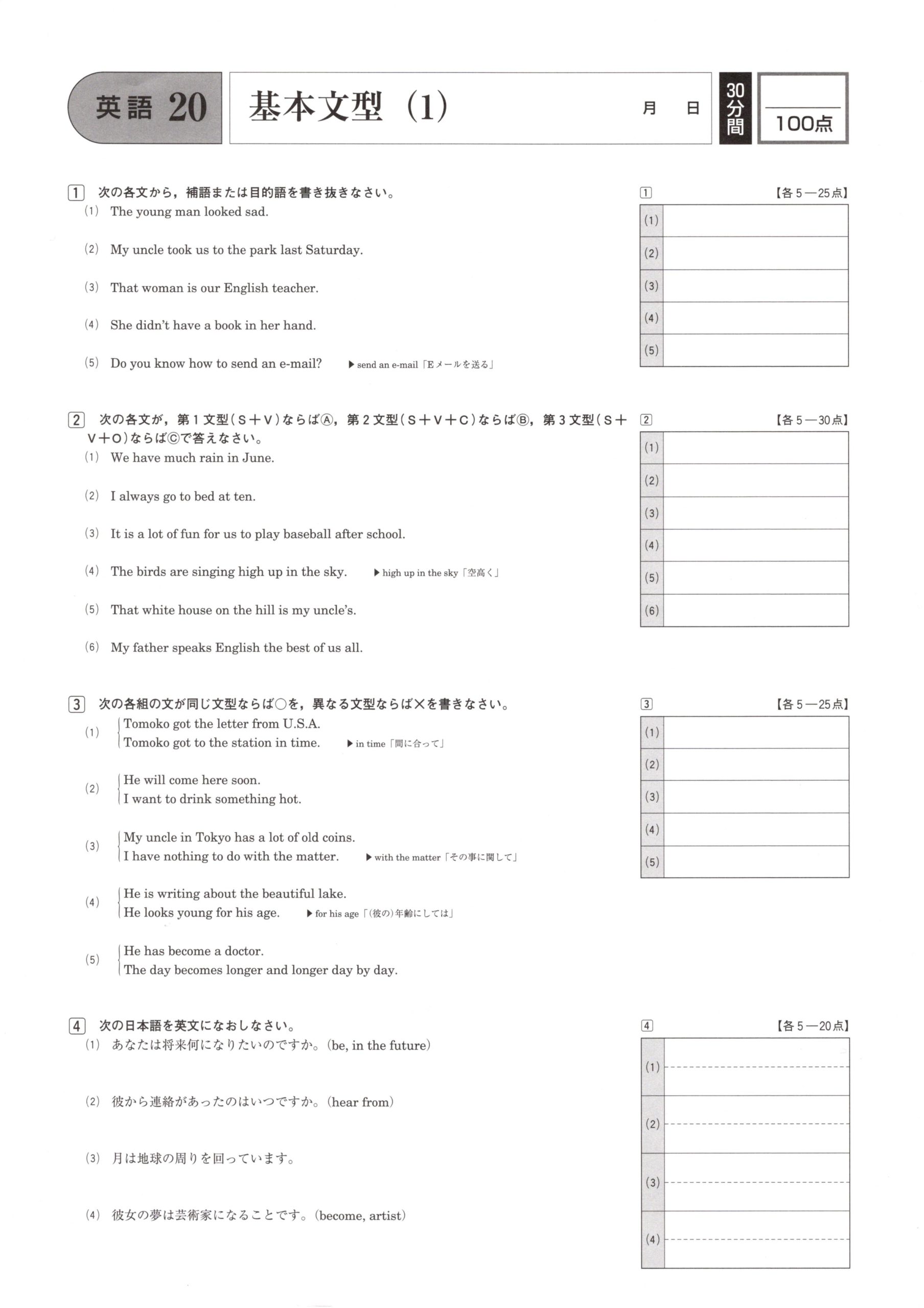 ⑳基本文型(1) 学力テスト対策 英語 2021.08.262021.08.27 スポンサーリンク スポンサーリンク ⑳基本文型(1)の問題はこちら 小さくて見にくいときはこちら 20 基本文型(1) 解答はこちら 学力テスト対策 英語 解答ページ 解説は下の動画を見てみよう。 大問ごとの解説動画1⃣ 大問ごとの解説動画2⃣ 大問ごとの解説動画3⃣ 大問ごとの解説動画4⃣ 大問ごとの解説動画5⃣ 大問ごとの解説動画6⃣