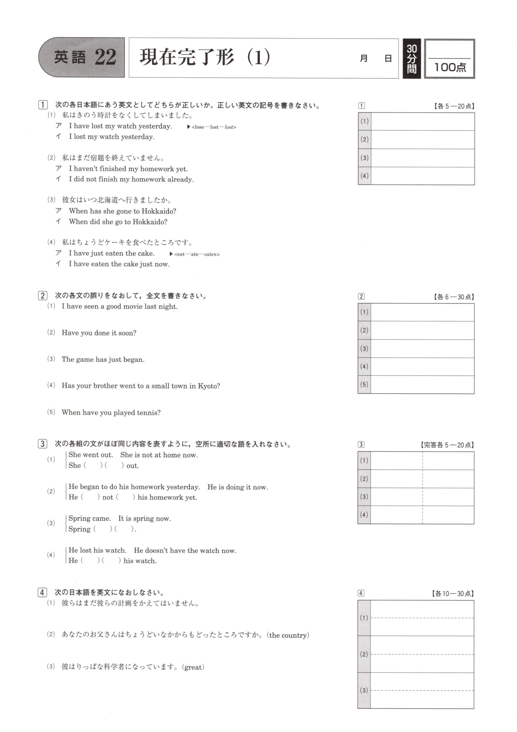 ㉒現在完了形(1) 学力テスト対策 英語 2021.08.262021.08.27 スポンサーリンク スポンサーリンク ㉒現在完了形(1)の問題はこちら 小さくて見にくいときはこちら 22 現在完了形(1) 解答はこちら 学力テスト対策 英語 解答ページ 解説は下の動画を見てみよう。 大問ごとの解説動画1⃣ 大問ごとの解説動画2⃣ 大問ごとの解説動画3⃣ 大問ごとの解説動画4⃣ 大問ごとの解説動画5⃣ 大問ごとの解説動画6⃣