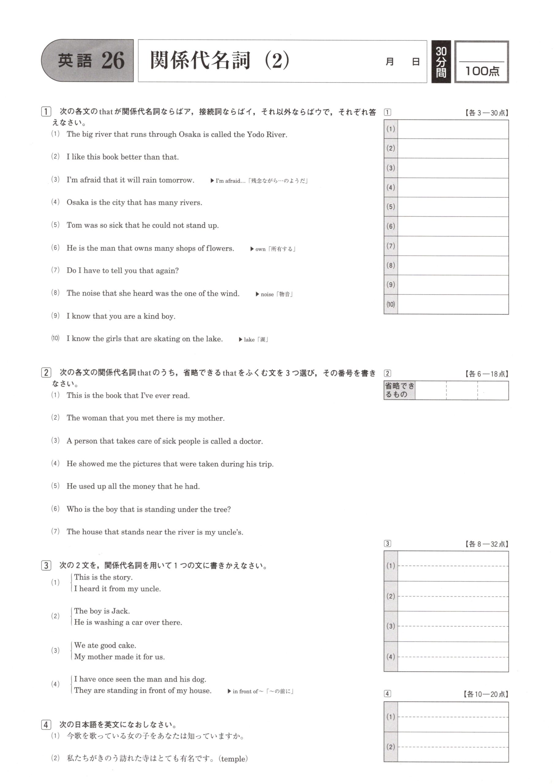 ㉖関係代名詞(2) 学力テスト対策 英語 2021.08.262021.08.27 スポンサーリンク スポンサーリンク ㉖関係代名詞(2)の問題はこちら 小さくて見にくいときはこちら 26 関係代名詞(2) 解答はこちら 学力テスト対策 英語 解答ページ 解説は下の動画を見てみよう。 大問ごとの解説動画1⃣ 大問ごとの解説動画2⃣ 大問ごとの解説動画3⃣ 大問ごとの解説動画4⃣ 大問ごとの解説動画5⃣ 大問ごとの解説動画6⃣